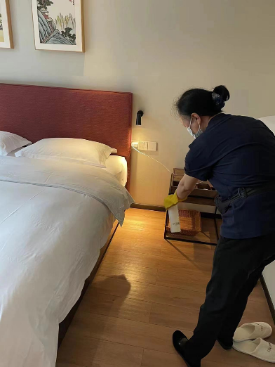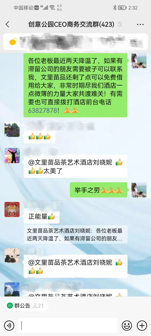 爱心的传递不仅仅在酒店内部。考虑到同时被紧急封控在园区可能缺少物资的其他公司员工,刘晓妮还在园区的企业交流群里发出了免费借出被子的信息,希望帮助大家共渡难关,获得一片赞誉。酒店解封后,送走了曾经共度特殊时期的客人们,又转头接待宝圣湖街道社区防疫相关工作人员,为他们提供温暖、舒适的住宿服务。刘晓妮说:“按照防疫要求,这段时间酒店对于所有入住客人都实行了健康码、行程码、核酸报告查验,客房工作人员在打扫完成后,对每个房间进行消毒,公共区域每天进行3次及以上消毒。截至目前,酒店每天入住率保持在85%左右,主要客户为街道抗疫人员和滞留重庆的差旅人士。但不管何时何地何人,文里苗品茶艺术酒店会竭尽全力,让每一位客人宾至如归。”
